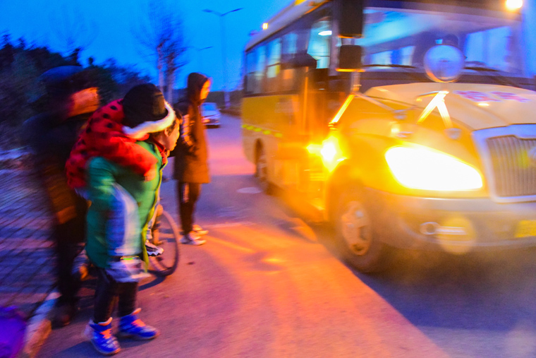 校車駛來,汪桂月麻利地背起婷婷,快步上車。圖片來源:銅陵日報(bào)