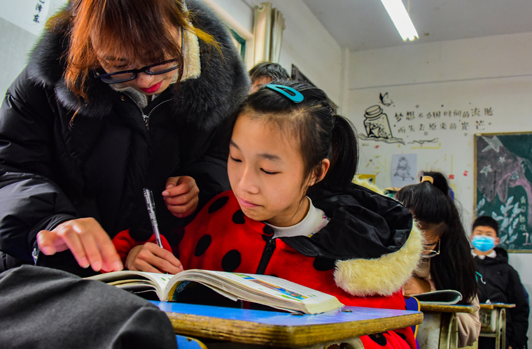 在課業(yè)學(xué)習(xí)上,班主任鐘莉悉心指導(dǎo)婷婷,為她釋疑解惑。圖片來源:銅陵日報(bào)