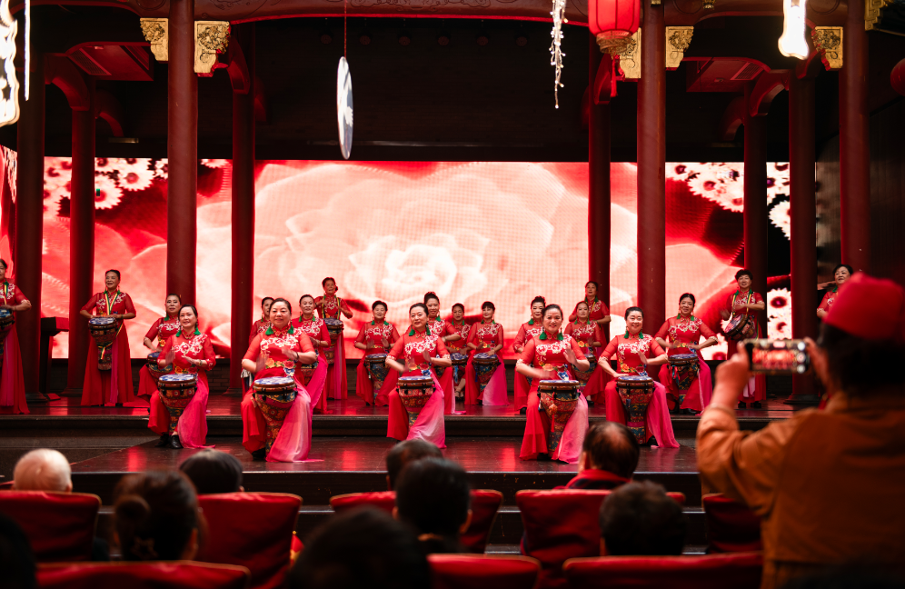 舞臺(tái)之上,精彩紛呈。歡快的手鼓敲響序曲,深情的詩朗誦叩動(dòng)心弦,《家和萬事興》唱出了對美好生活的期盼,還有燈籠舞《五哥放羊》、電吹管合奏《櫻桃樹下》、《江南少女》舞蹈、旗袍秀《我們的中國夢》等精彩節(jié)目。當(dāng)《我和我的祖國》旋律響起,滿頭銀發(fā)的老人們不約而同地?fù)]舞起了手中的紅旗。