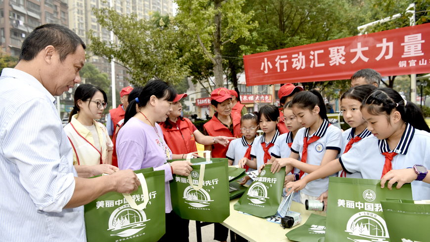 10月11日,銅官山社區(qū)新時(shí)代文明實(shí)踐所、銅官山社區(qū)關(guān)工委和市實(shí)驗(yàn)小學(xué)聯(lián)合開展“小行動(dòng)匯聚大力量、你我共參與垃圾分類”活動(dòng),社區(qū)志愿者和小學(xué)生們一起為附近居民發(fā)放垃圾袋、手提袋和宣傳單頁,引導(dǎo)大家積極參與垃圾分類,共創(chuàng)美好生活環(huán)境。記者 儲(chǔ)著傳 攝